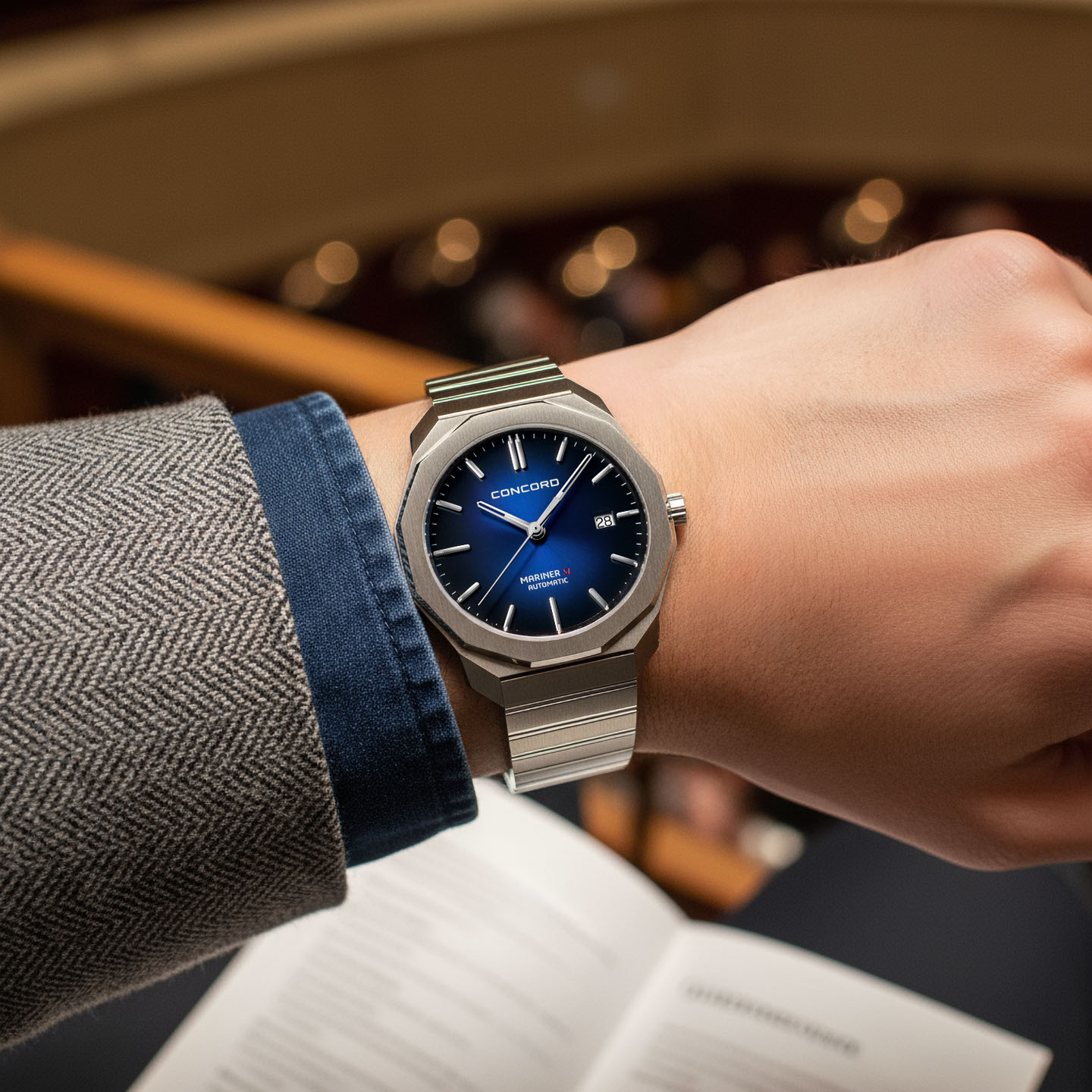 ネイビーの文字盤を持つ時計は、フォーマルからスマートカジュアルまで幅広く使える万能アイテムです。特にネイビーのジャケットやデニムとの相性は抜群で、グラデーションになっている文字盤のディテールは上品さを演出し、装いをワンランク上に格上げしてくれます。 裏側のシースルーバックからは、ムーブメントが美しく動く様子をご覧いただけ、高品質という「本物の価値」を物語っています。 手に取った時のしっかりとした質感も含め、機能美と精巧なつくりは、所有する喜びを深く満たしてくれます。
