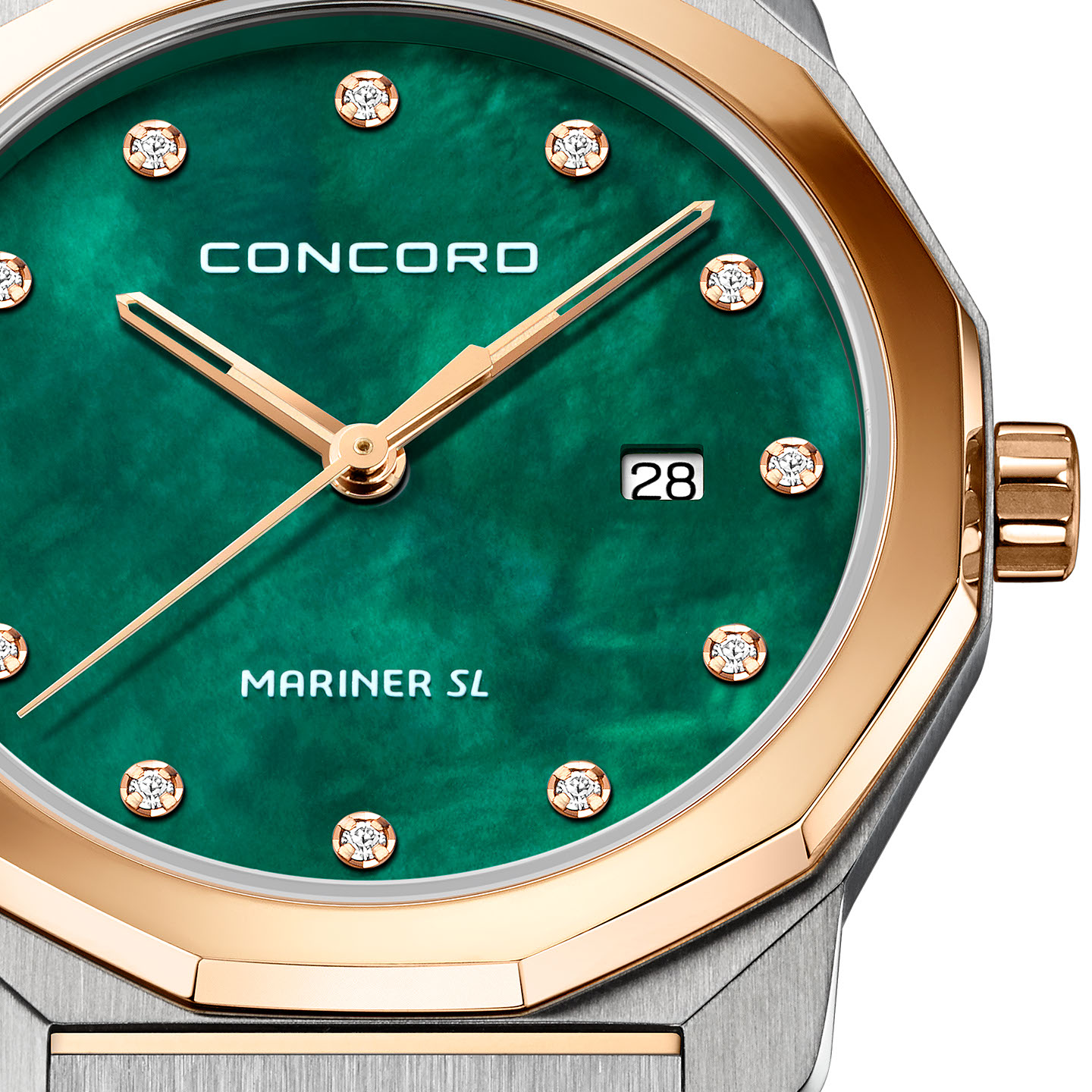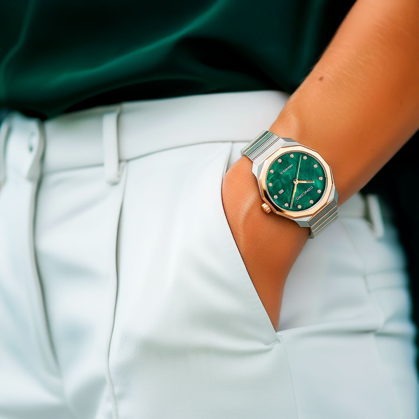 鮮やかなグリーンが目を引くマザー・オブ・パールの文字盤は 天然素材ならではの独特な模様と光沢が、手元で唯一無二の存在感を放ちます。 インデックスにはダイヤモンドが配されており 12面ベゼルと同じピンクゴールドの枠で華やかな彩りを加えます。 ウッドデッキから着想を得たピンクゴールドをアクセントにしたブレスレットのデザインが スポーティながらもエレガントな印象を与えます。 オンオフ問わず、幅広いシーンで手元を華やかに彩る、洗練された腕時計です。