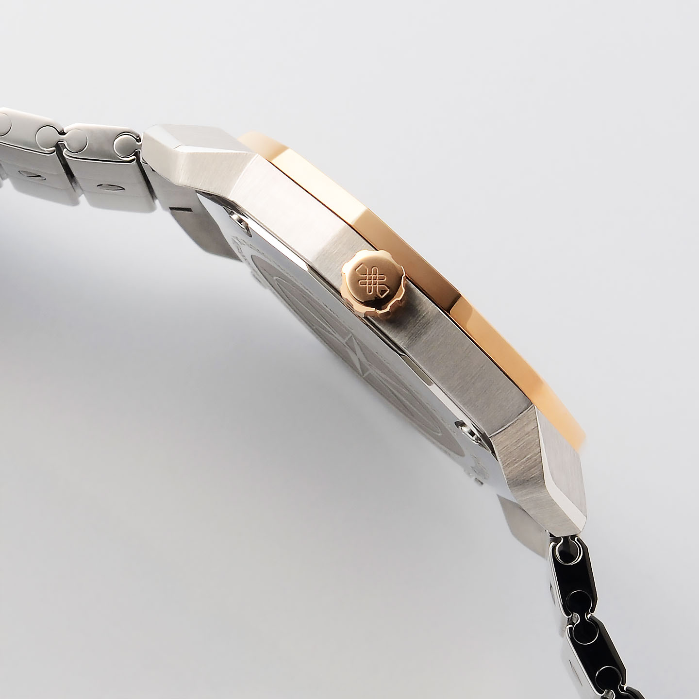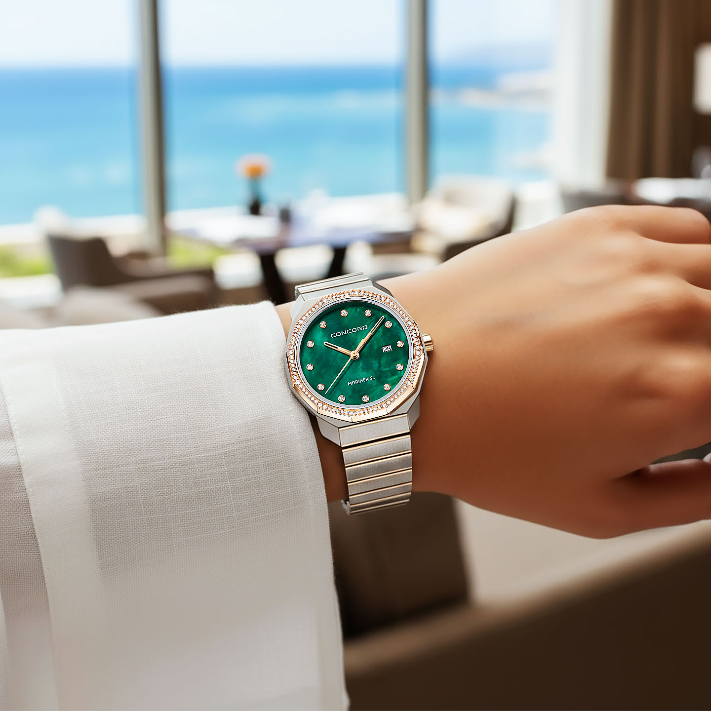 濃淡のある深いグリーン色のマザー・オブ・パール文字盤の上品な輝きは、品格ある佇まいでありながら確かな存在感を放ち、表情豊かに唯一無二の輝きを手元に彩ります。 自然を想起させる深いグリーンの色調は、心理的な安らぎや信頼感をもたらし、リゾートからビジネスまで幅広いシーンで活躍します。 堅牢なステンレススチールに華やかなピンクゴールドやダイヤモンドのアクセントが上質なエレガンスを演出し、 大人の落ち着きを保ちながらも、手元にさりげなく個性を主張する差し色として、装いを格上げする逸品です。