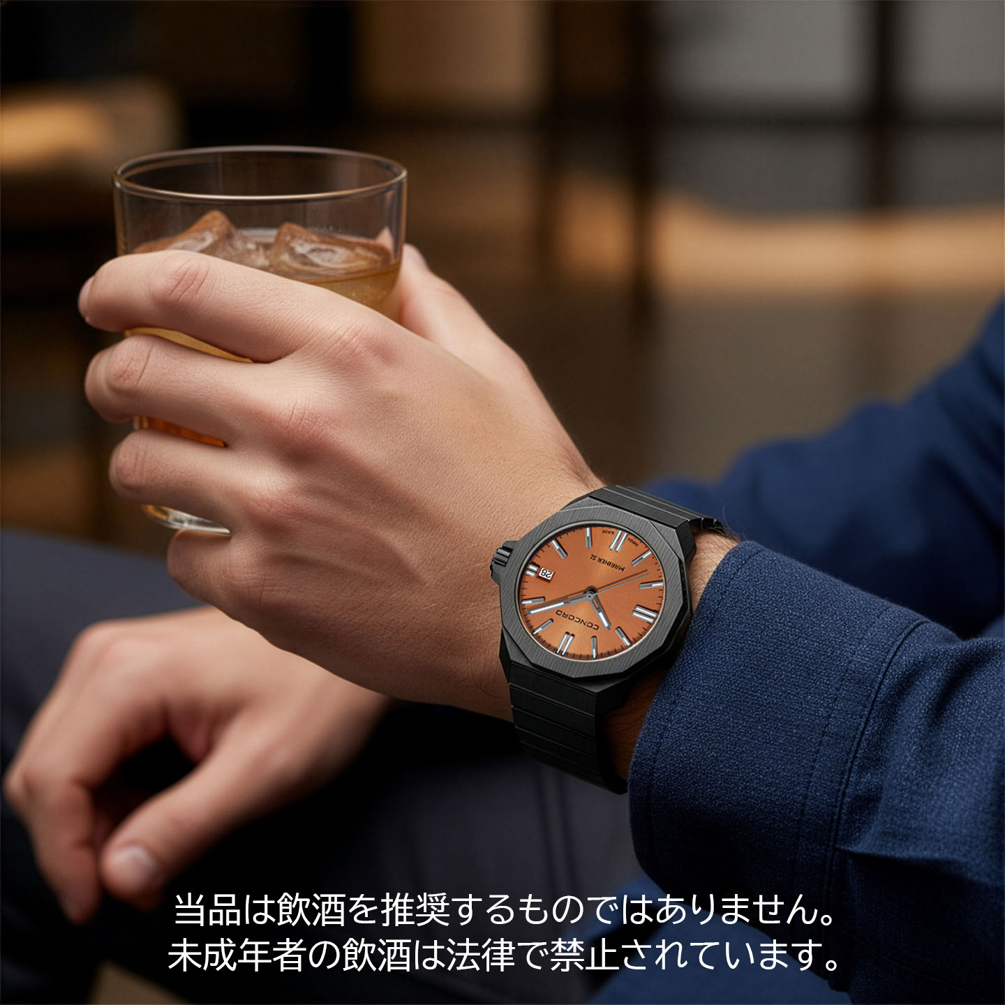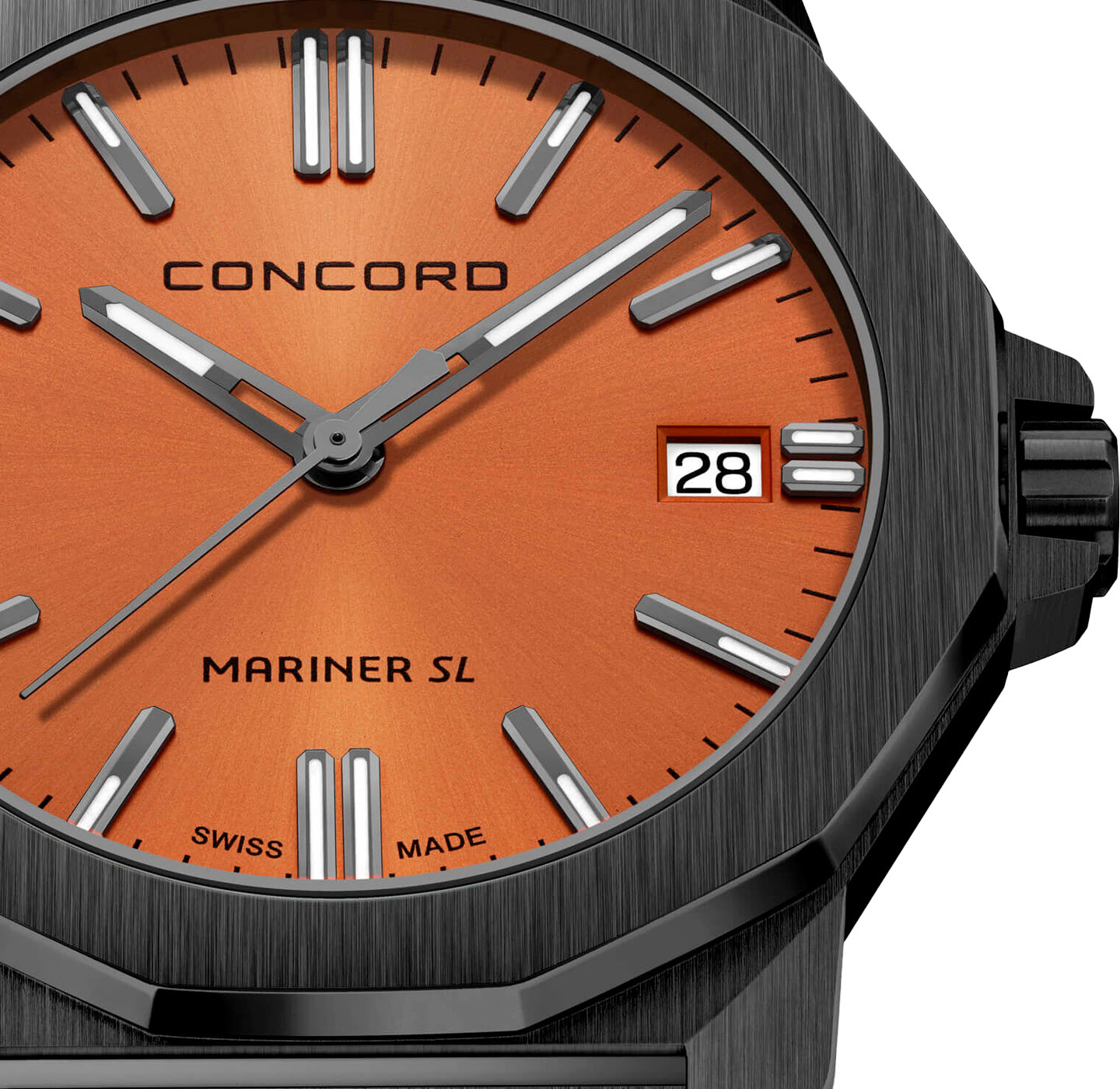 オレンジ色の文字盤は、身につけているだけでお洒落な人に見せてくれます。特に上品な濃い色オレンジは、遊び心がありながらも、落ち着いたシックなイメージになります。 腕時計本体はオールブラック。ステンレススチール製の本体に、プラズマ化した金属を蒸着させるPDV加工を施すことで、深淵なブラックを実現しました。PDVは半永久的に剥離の心配がなく、安心してお使いいただけます。また耐摩耗性、耐熱性、耐食性に優れ、日常の傷がつきにくく、目立ちにくいタフネスを誇ります。 10気圧防水に加え、スーパールミノバ夜光塗料がインデックスに塗布されているので暗い場所で怪しく光るのもデザインのポイント。 タフネス、美しさ、そして個性が凝縮されたオレンジ色のコンコルド・マリナー・ブラック。ずっしりとした漆黒の質感は、身につけた瞬間に深い満足感を与え、あなたの手元で静かに時を刻みます。
