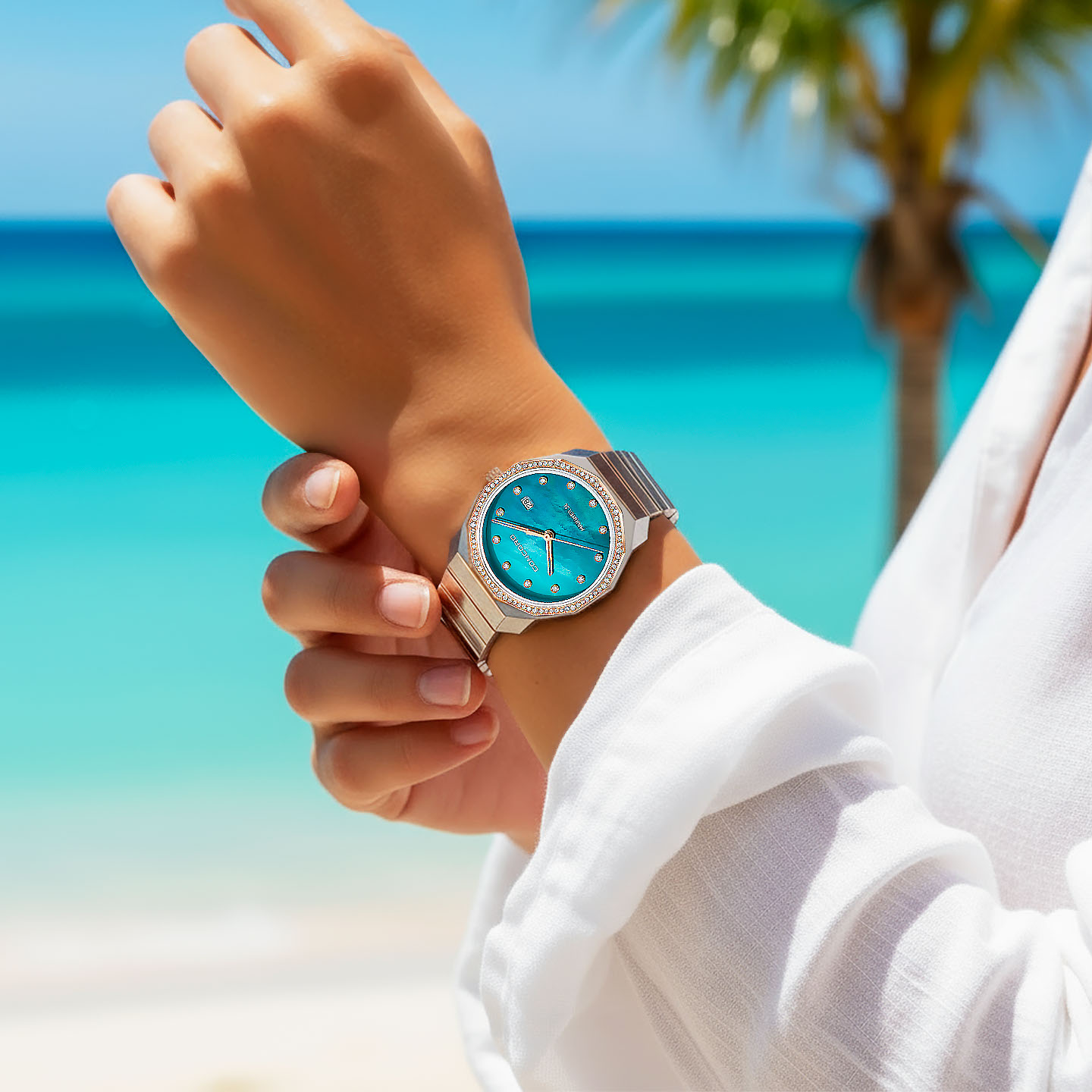 文字盤には、ネオンブルーカラーのマザー・オブ・パールを使用。光の角度で表情を変える神秘的な輝きは、穏やかな海面を連想させてくれます。 ダイヤモンドが贅沢に使われているのもポイント。華やかに手元に輝きを添えてくれます。 マットな質感のステンレススチールと、肌馴染みの良いピンクゴールドのコンビネーションは、華美ではない品格のある贅沢さを漂わせてくれます。 リゾートスタイルだけでなくオンオフ問わず上品なクラス感を演出してくれるデザインです。