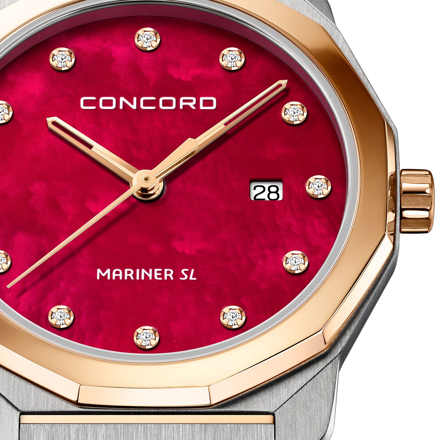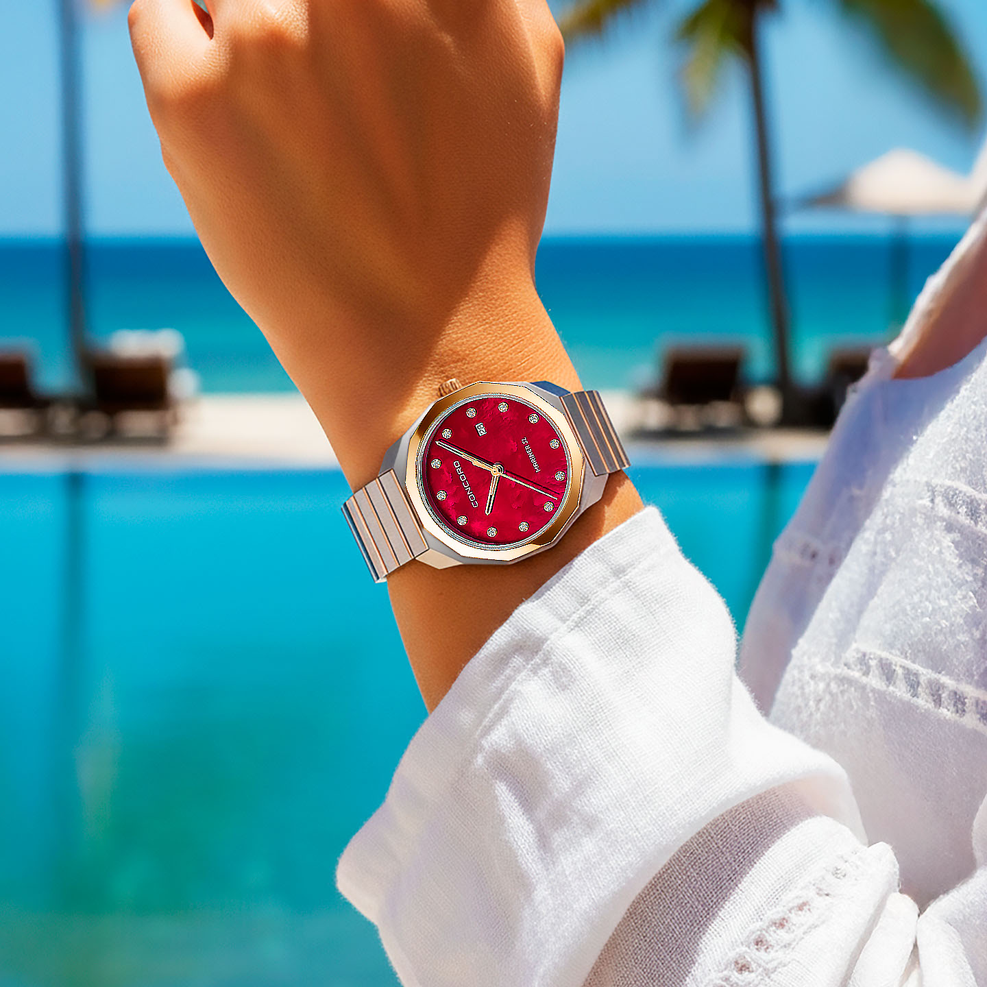 光の角度によって表情を変える深いレッドカラーのマザー・オブ・パールの文字盤とピンクゴールドのコントラストが印象的な華やかな腕時計です。 ケースやインデックスにはダイヤモンドがセッティングされ、一層の輝きを添えています。 ベルトは硬質なステンレスチールにピンクゴールドがアクセントであしらわれ温もり感のある優しい雰囲気になっています。 リゾートスタイルはもちろん、深いレッドカラーを主役にしたファッションやホリデーシーズン等オケージョンでの華やかなアクセントとしても表情豊かに手元を彩ってくれる逸品です。
