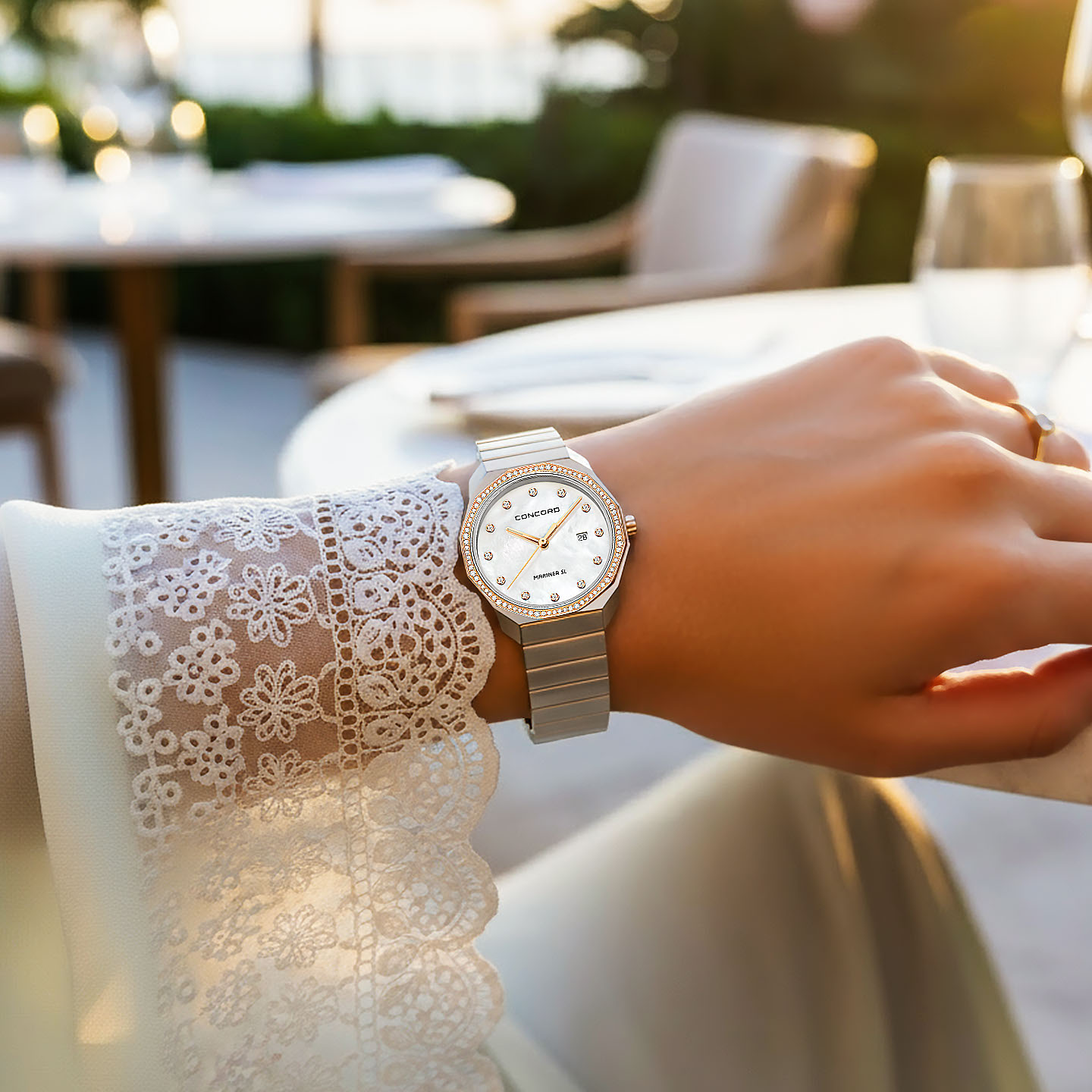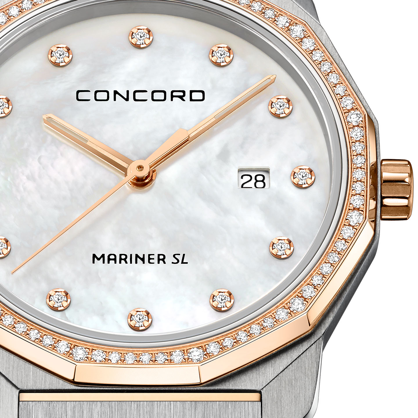 光の加減で表情を変えるマザー・オブ・パールの文字盤はその神秘的な虹色の輝きと自然が生み出す柔らかな光沢が装いに品格を添えてくれる逸品です。 中でもコーディネート力の高いホワイトカラーのマザー・オブ・パール文字盤は幅広いシーンで活躍する万能な人気アイテムです。 ベゼルにはダイヤモンドを取り巻き、文字盤にもダイヤモンドインデックスが配され、優雅なきらめきを放ちます。 ステンレススチールとピンクゴールドの洗練されたバイカラーデザインは、マザー・オブ・パールやダイヤモンドの輝きと相まって、唯一無二のエレガンスを演出してくれます。