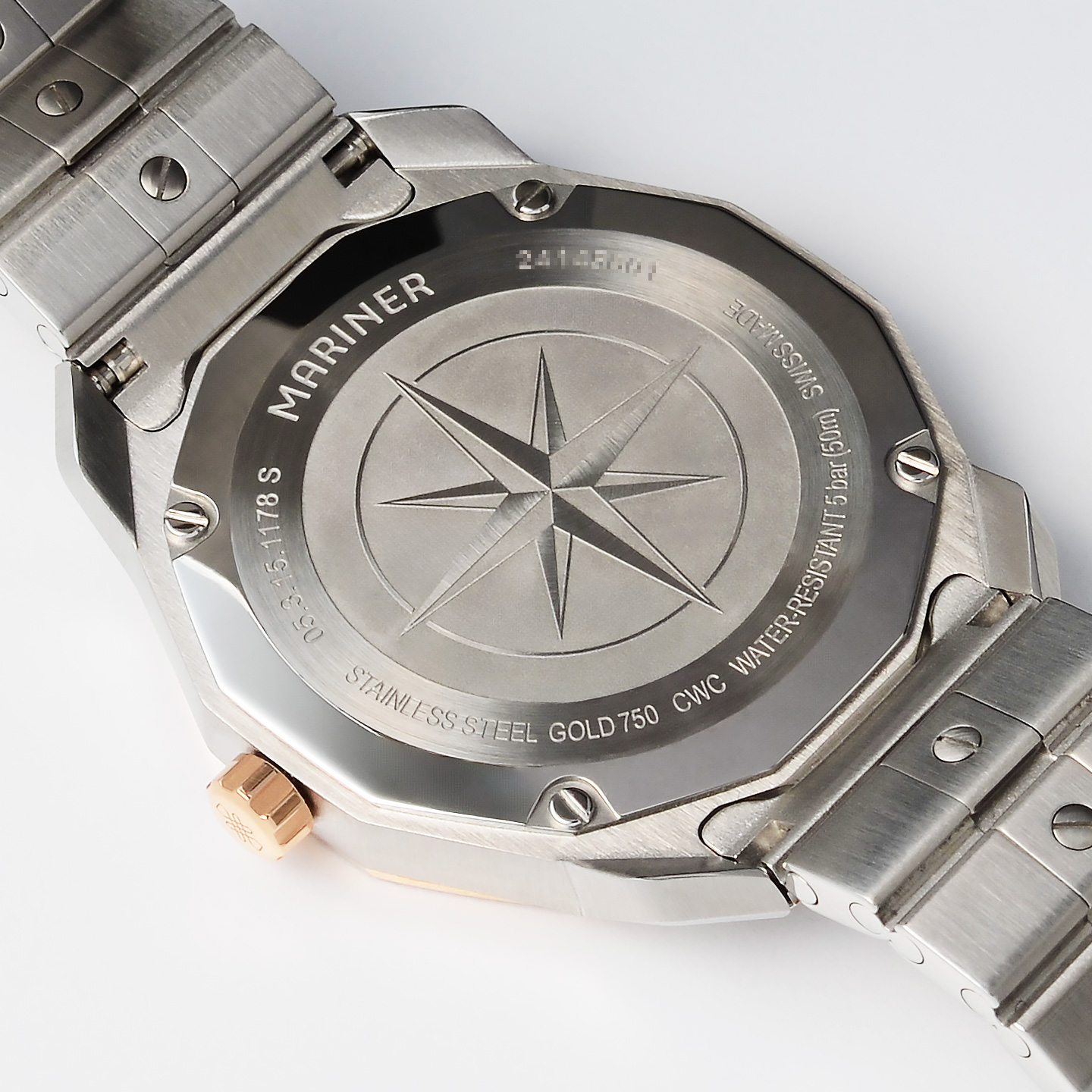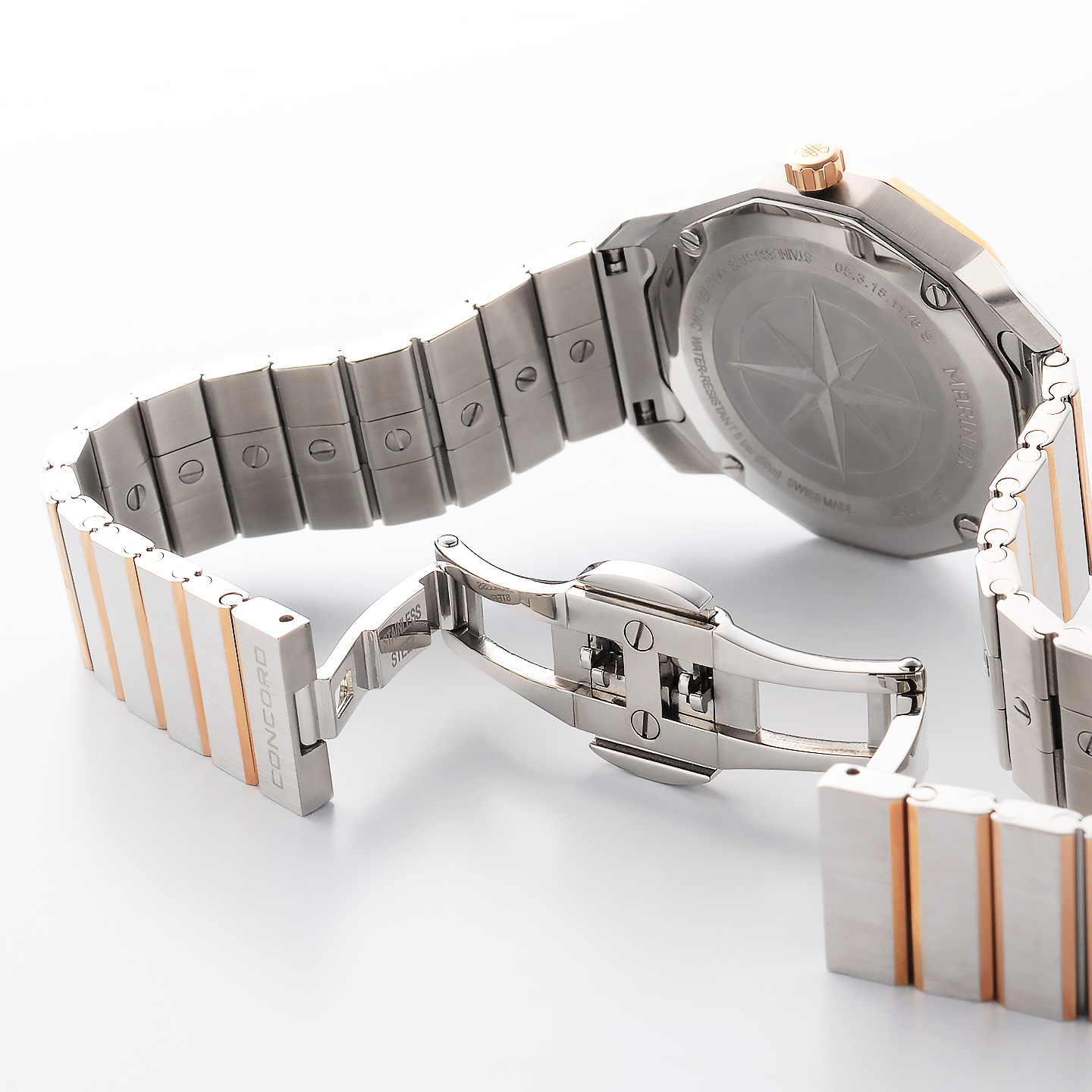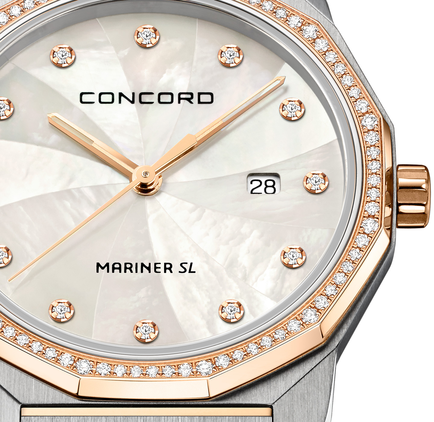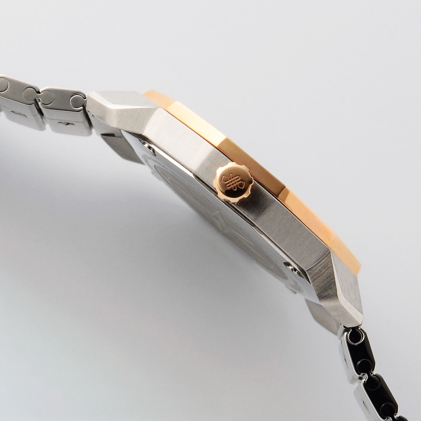 アイボリーカラーの白蝶貝文字盤とピンクゴールドの組み合わせが、上品で可憐な雰囲気を演出する逸品です。 文字盤は12枚のスパイラル形状のパーツで構成され、角度によって様々な表情を見せる遊び心満点のデザイン。ブレスレットにも惜しみなくピンクゴールドのパーツを使用し、どこから見てもラグジュアリーな佇まいを感じさせます。 華美になりすぎないのは、ピンクゴールドのたおやかな輝きがあるからこそ。さらに、ベゼルには天然ダイヤモンドを贅沢に取り巻き、上質な大人のリゾートスタイルを完成させます。