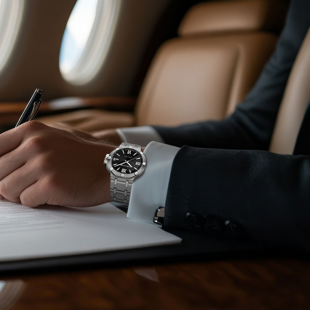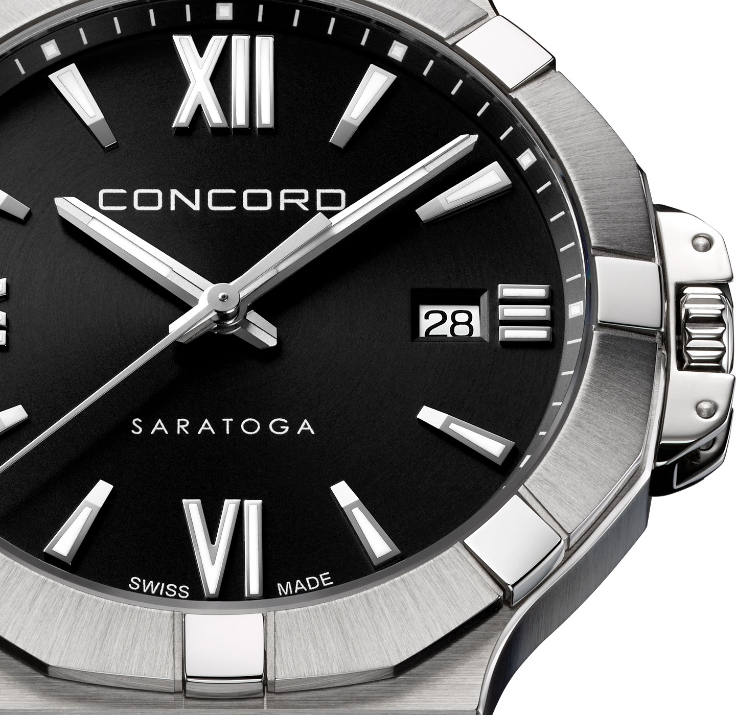 黒(ブラック)文字盤は、力強い存在感が魅力です。 コンコルド・サラトガのスポーティーなイメージをより一層際立たせ、スタイリッシュで洗練された雰囲気を醸し出します。 ビジネスシーンでは、嫌味のないかっこよさを演出し、プライベートやカジュアルな装いでは、手元を引き締めスマートに見せてくれます。 フォーマルな場面からカジュアルな装いまで、幅広いシーンで活躍し、確かな時を刻み続けます。